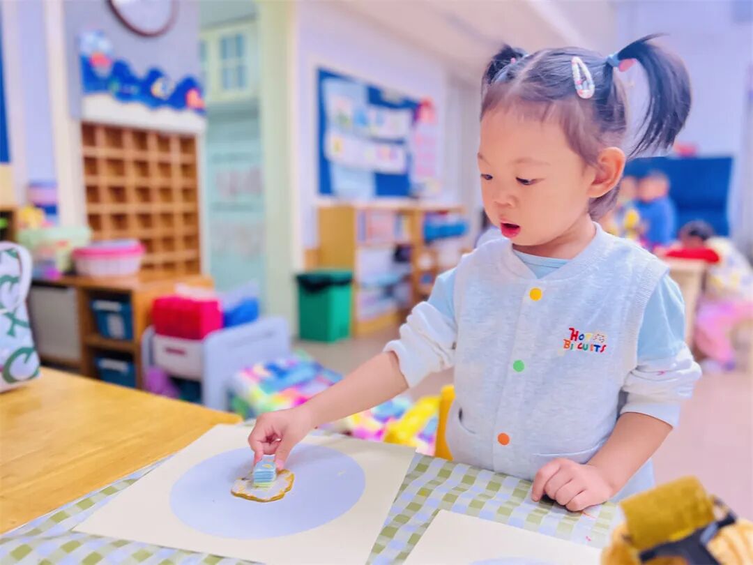走进中班教室,热闹的“拓印月饼”手工活动正精彩上演。为让孩子们更好地感受中秋元素,老师们提前做好充足准备,不仅定制了造型各异的自制月饼印章,还搭配了色彩鲜亮的各色颜料与质感细腻的画纸,更通过实物展示不同花纹的月饼图案,直观呈现传统月饼的精巧造型,激发孩子们的创作兴趣。活动中,孩子们瞬间化身为“小小糕点师”,神情专注又认真。只见他们一手稳稳按住画纸,一手紧握蘸满颜料的月饼“印章”,轻轻向下一压,一个个带着清晰花纹的“月饼”便鲜活地跃然纸上。不少孩子还充分发挥奇思妙想,用黄色颜料点缀“蛋黄”,用棕色颜料勾勒精致“花纹”,让笔下的“月饼”愈发生动逼真。“我要拓印一个最漂亮的送给妈妈!”稚嫩的话语与欢快的笑声交织在一起,满是孩子们对中秋佳节的期待,以及对家人最纯粹的爱意。