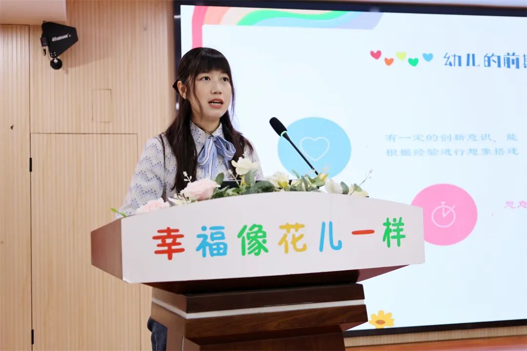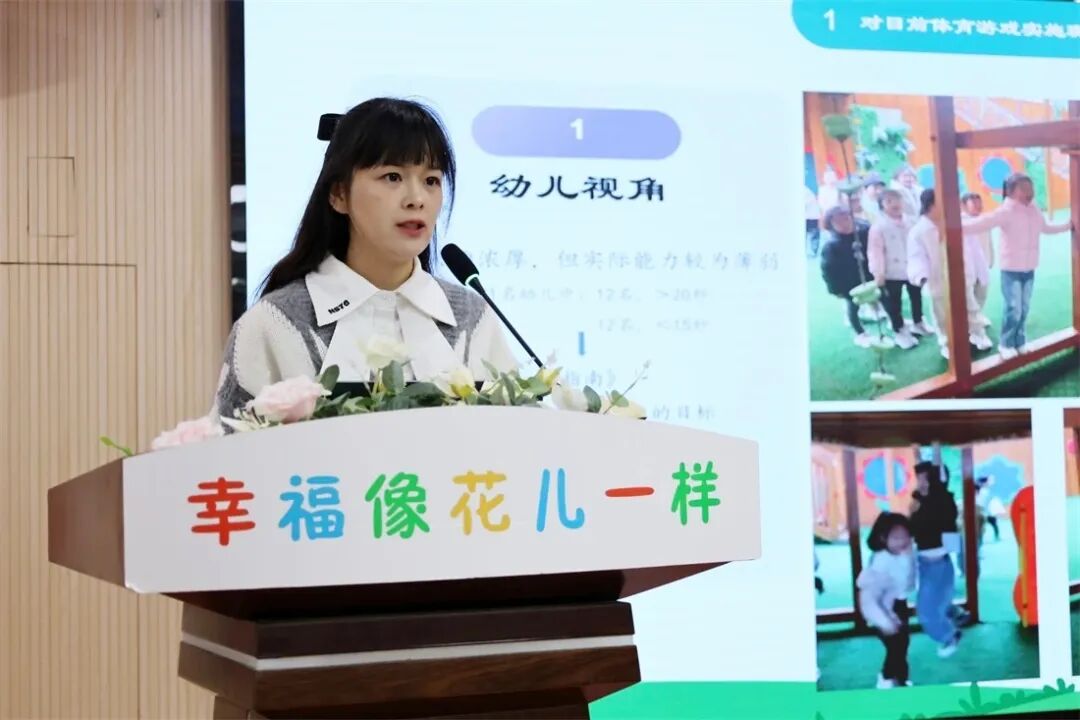 紧接着,骨干教师姜晗潇分享了实录游戏案例《酷酷的钢铁侠盔甲》,深度解读了创造性游戏中的教师支持策略。她通过细致的游戏视频和观察记录,还原了幼儿从萌发“制作钢铁侠盔甲”的想法,到在游戏中遇到材料选择、结构搭建、团队协作等问题的全过程。姜老师表示,创造性游戏是幼儿想象力与创造力的集中体现,教师的核心作用在于“读懂幼儿、支持幼儿”。在整个游戏过程中,教师始终以观察者、支持者、引导者的身份,尊重幼儿的前期经验,鼓励幼儿自主发现问题、大胆思考解决方案,通过适时提供材料支持、引发思维碰撞、梳理游戏经验,推动幼儿的游戏持续深入开展,让幼儿在解决问题的过程中实现能力的全面提升。她的分享让在场教师对创造性游戏的解读与支持有了更深刻的认知。