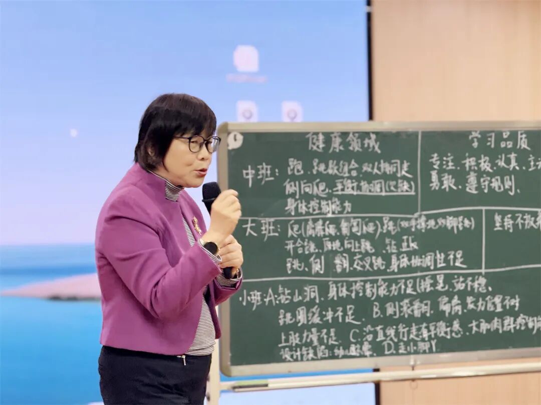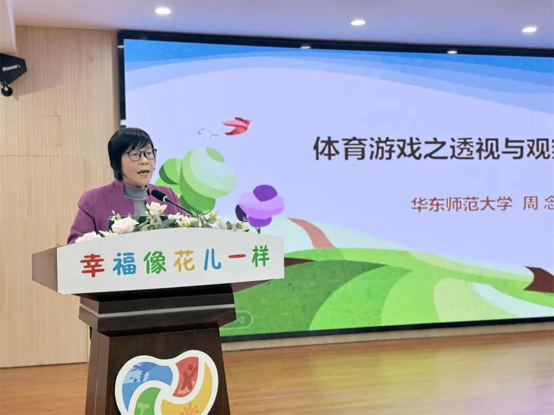 最后,周念丽教授带来了以“体育游戏之透视与观察”为主题的专题讲座。她结合大中小班三个年龄阶段的实例,生动阐释了体育游戏在促进幼儿身体、认知、社会性、情绪全面发展中的多元价值,并详细辨析了“体育活动”与“体育游戏”的本质区别。周教授指出,教师的支持应建立在充分观察和理解的基础上,让幼儿在快乐的游戏中实现真正的成长。整场讲座理论与实践紧密结合,令在场教师茅塞顿开,对如何科学有效地组织与指导幼儿体育游戏有了更加清晰的认识。