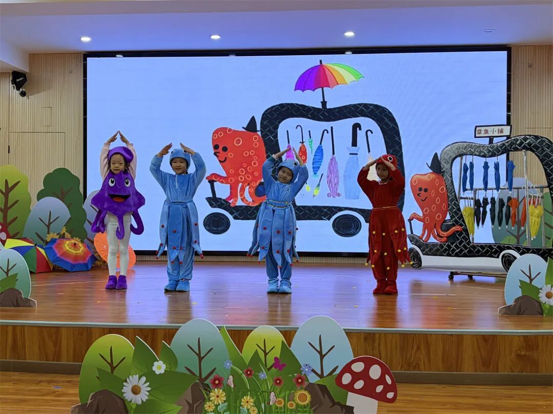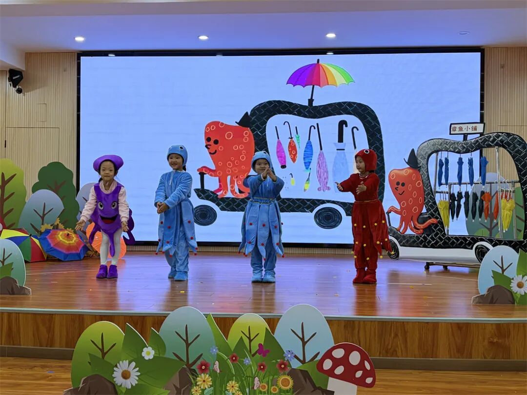 表演当天,幼儿园多功能厅座无虚席,家长们手持相机、手机,期待着孩子们的登场。绘本剧《咕咚来了》中,孩子们用夸张的表情和动作,演绎出“小动物们逃跑”与“发现真相”的反差,逗得家长们阵阵欢笑。《彩虹色的花》里,扮演“小花”的孩子一次次“送出花瓣”,温柔的语气传递出善意,不少家长流露出感动的神清。《章鱼先生卖雨伞》的“小演员”们,一边展示自制的“特色雨伞”,一边清晰地说出台词,展现出出色的语言表达能力。