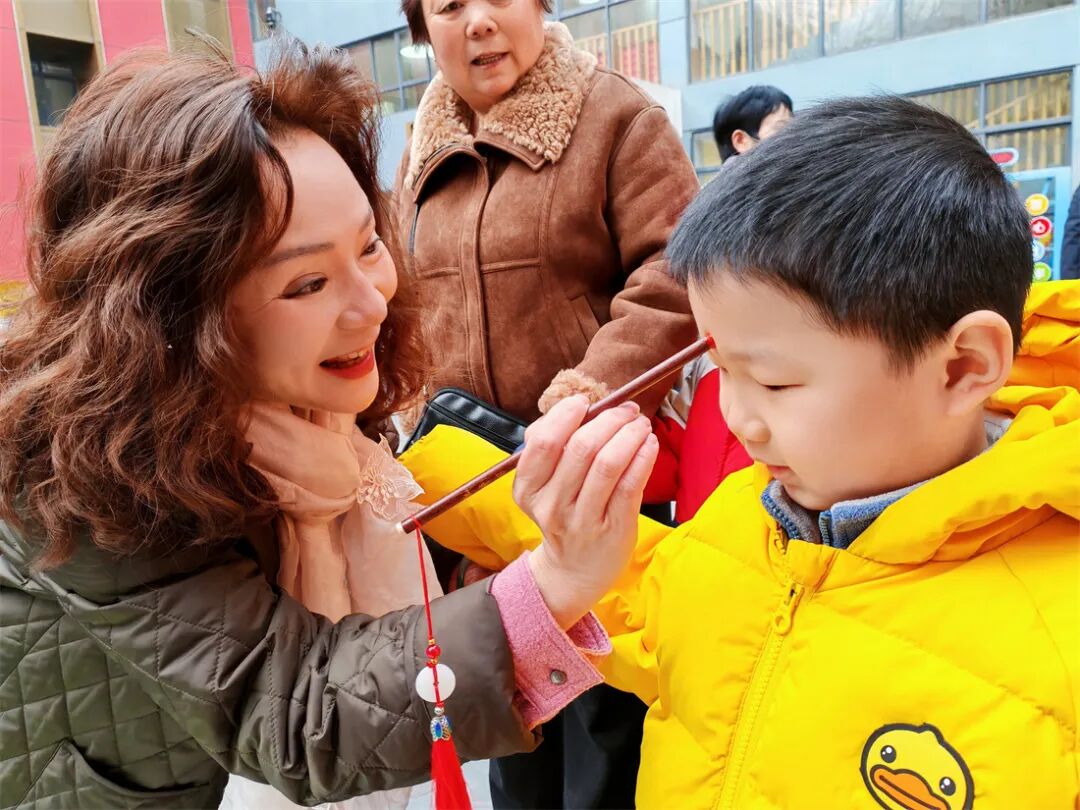 入园伊始,最具传统韵味的“朱砂启智”仪式率先拉开帷幕。幼儿园领导班子齐聚园门口,手持毛笔,蘸取朱砂,俯身轻点于每位返园幼儿的额头正中。这一源自古代启蒙教育的仪式,象征着为孩子开启智慧之眼,寓意从此心明眼亮。一颗颗红痣饱含着园长和老师们对孩子们的美好祝愿——愿他们在新学期里眼明心亮,开蒙启智,从此乐学、好学、善学。