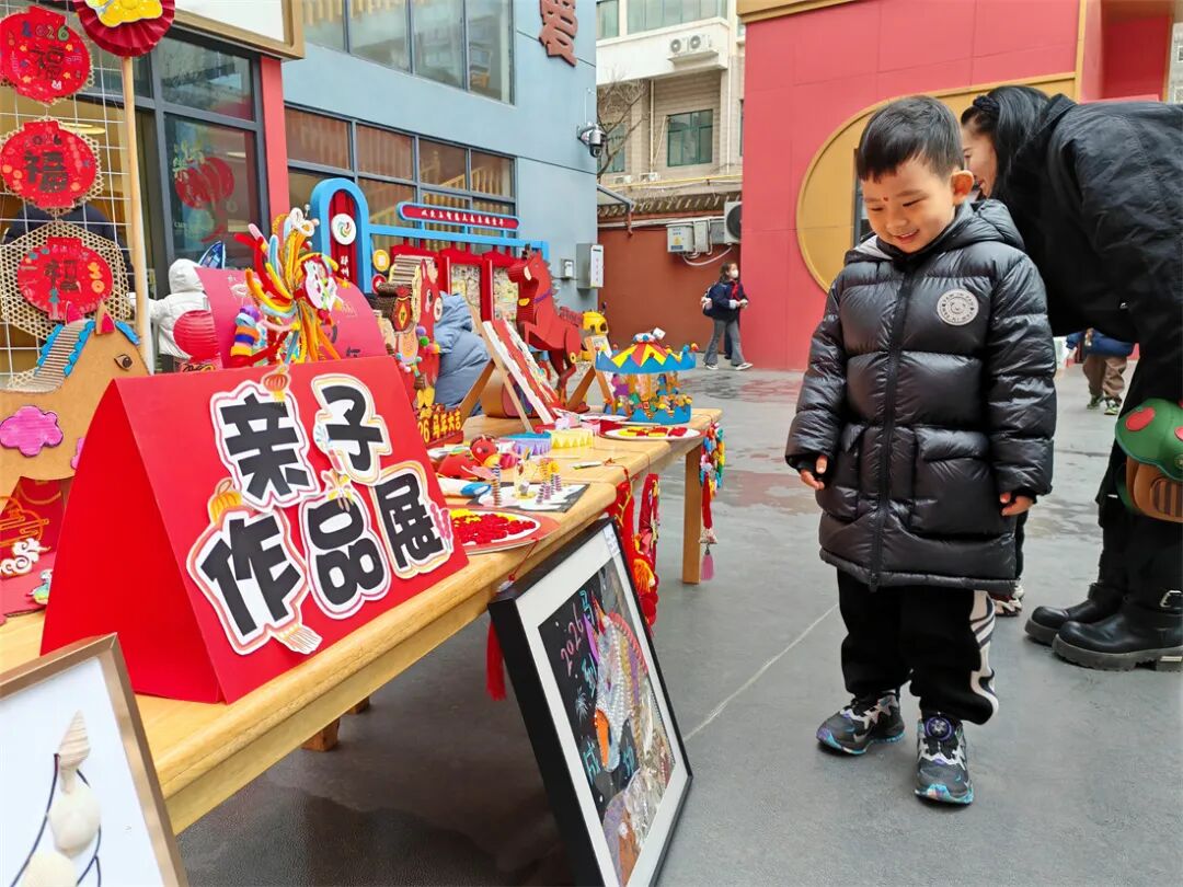 小班的弟弟妹妹则在爸爸妈妈的陪伴下,参观亲子手工创意作品展。他们慢慢参观、细细欣赏,一会儿在这幅作品前驻足,一会儿又在那幅作品前开心交谈,还有的小朋友主动向同伴介绍自己和爸爸妈妈制作的作品。